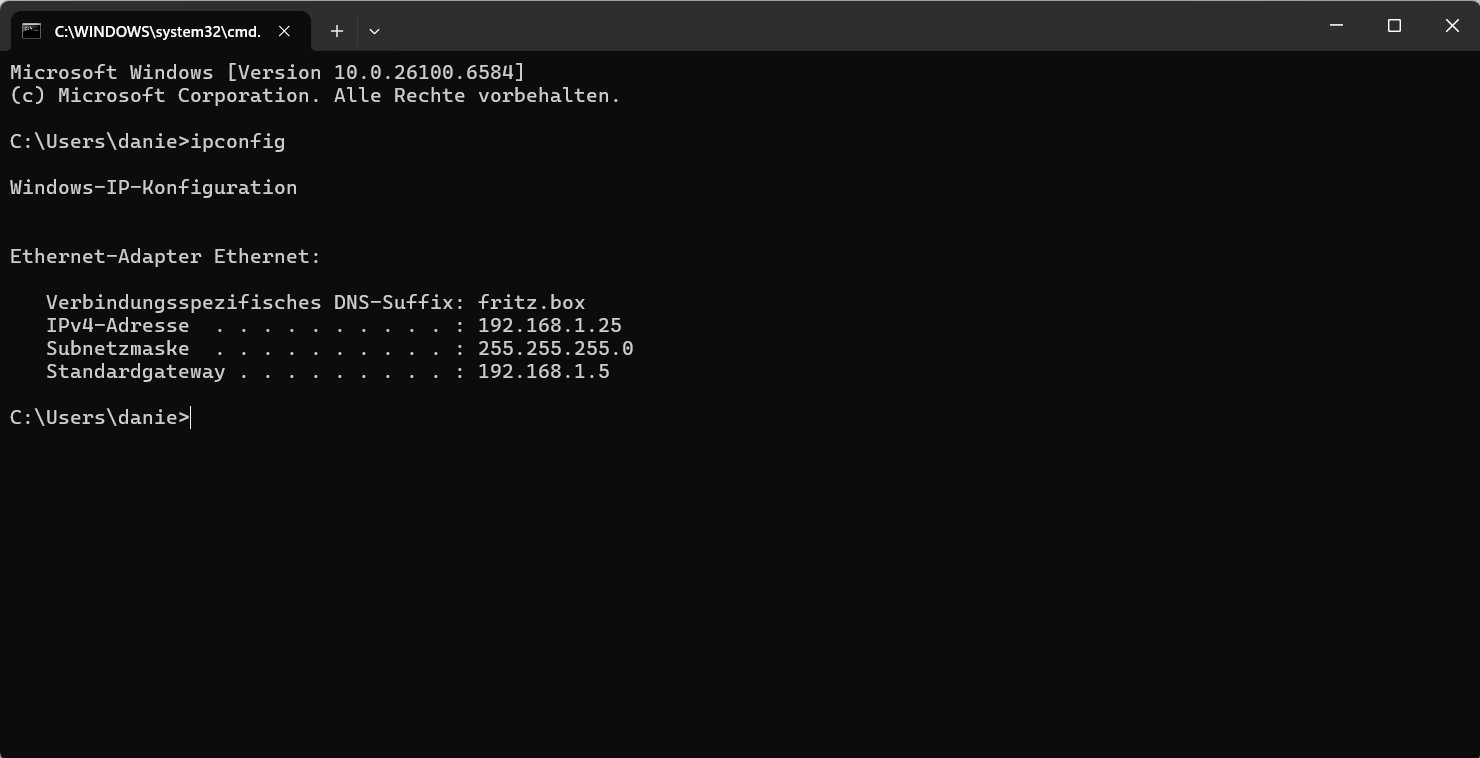 Schreibe im Konsolenfenster ipconfig und drücke die Enter-Taste.
